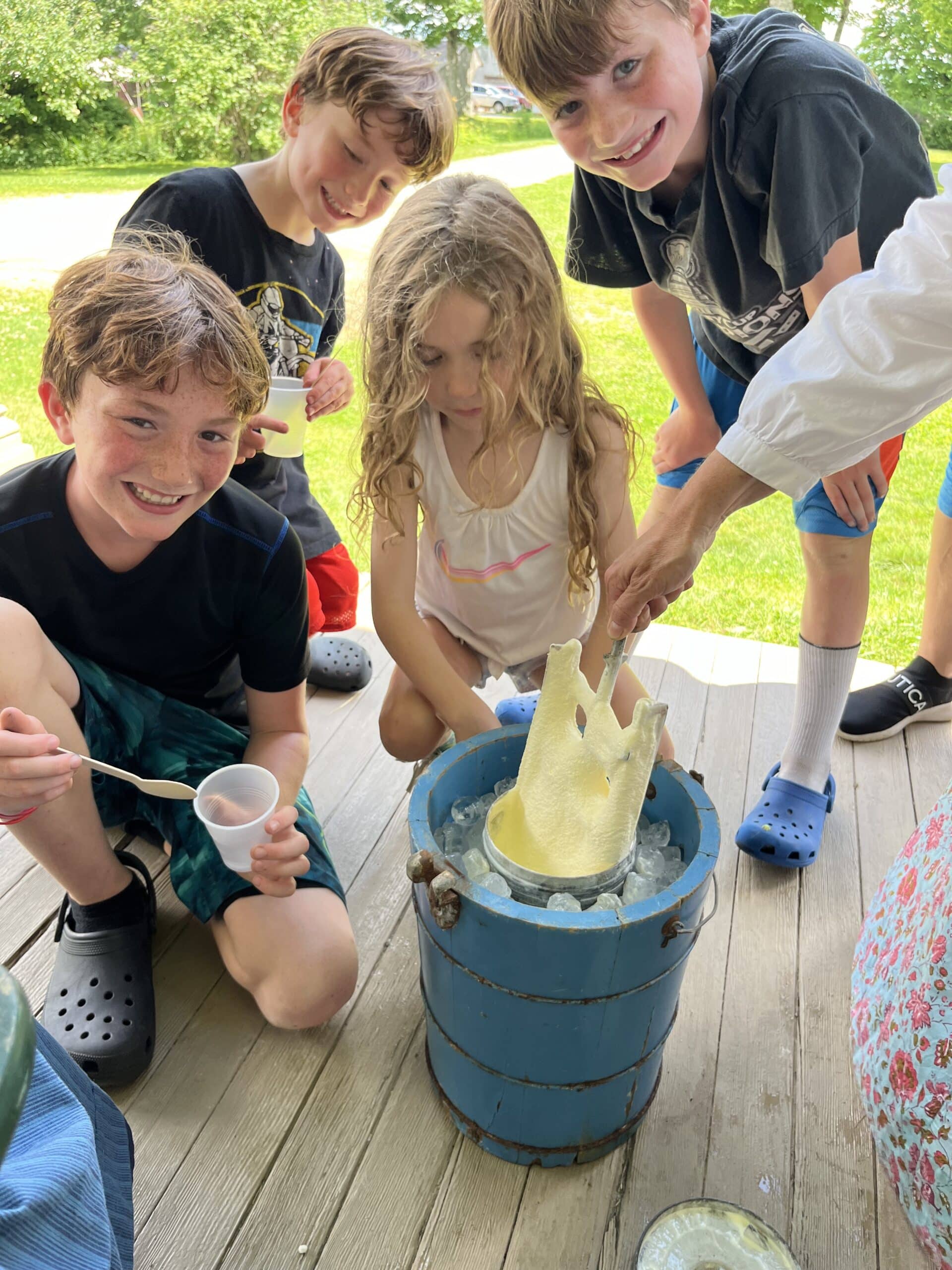 Ice Cream Making – churn and eat – homemade ice cream (contains eggs) it takes a while back in 1870. The cranking starts at 2:30